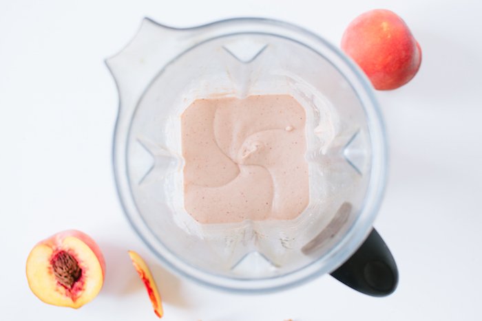 This peach smoothie asks you to do just that. In fact, you can begin the night before, when you soak your cashews and freeze your peaches for the next day. In the morning, before you drain the water from the cashews, toss together a few ingredients to make your cinnamon crumble. Bake for a few, blend the rest, and voilà.